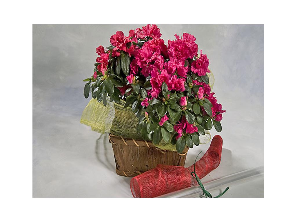 Precioso cesto de mimbre natural con azaleas en flor. Envuelto con celofán y lazada. Entrega gratis.