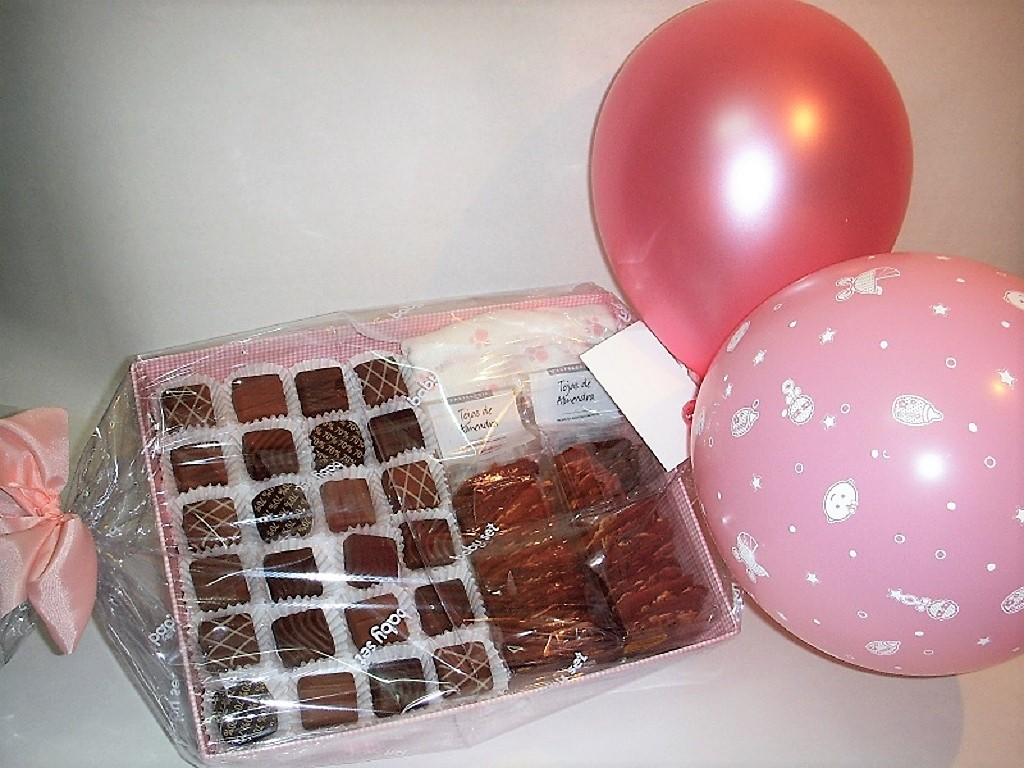 Bandeja de vichy con bombones lindt, tejas y gasa de algodón estampada para el bebé. Envuelta con lazos y globos. Entrega gratis donde nos indiques.