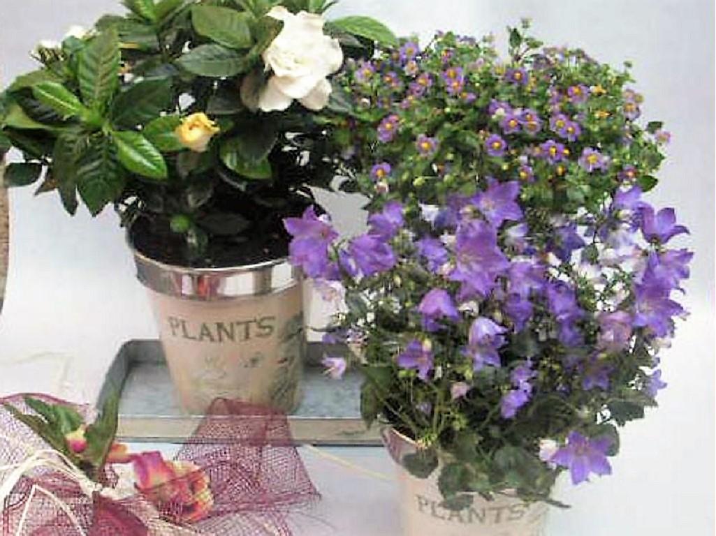 Preciosa bandeja de lata decorada con 2 plantas en macetero lacado a juego. Preciosa presentación.