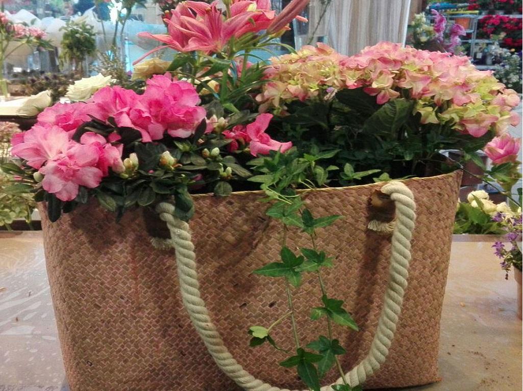 Precioso bolso de anea repleto de flores. Puedes elegir el contenido con plantas o flor cortada. Maravilloso regalo. Entrega gratis.