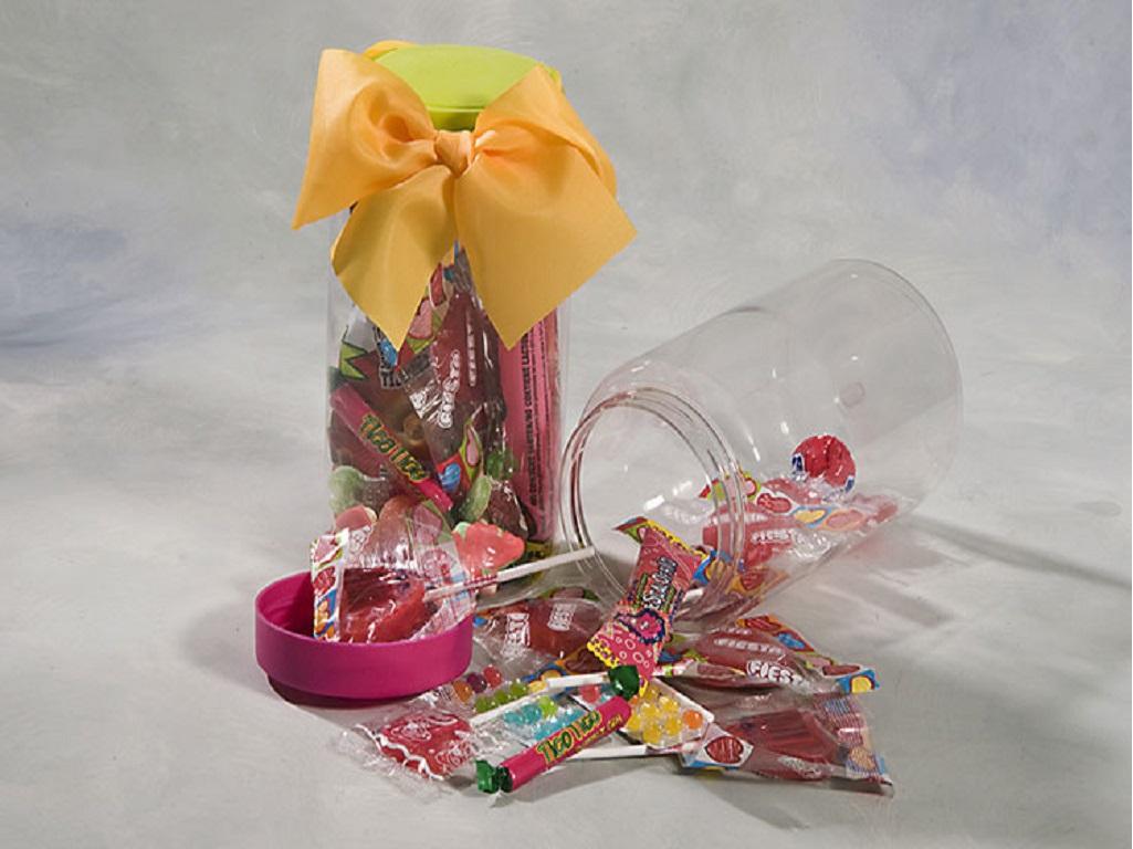 Graciosa presentación de exquisitas chuches y caramelos en bote de plástico transparente y colorida tapa. Envuelto con celofán y lazada con adornos infantiles y acompañada de globos. Ideal para niños. Entrega gratis.