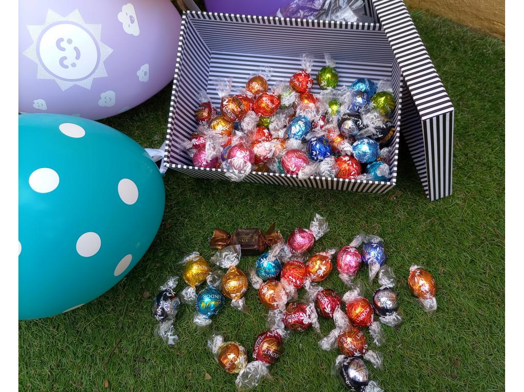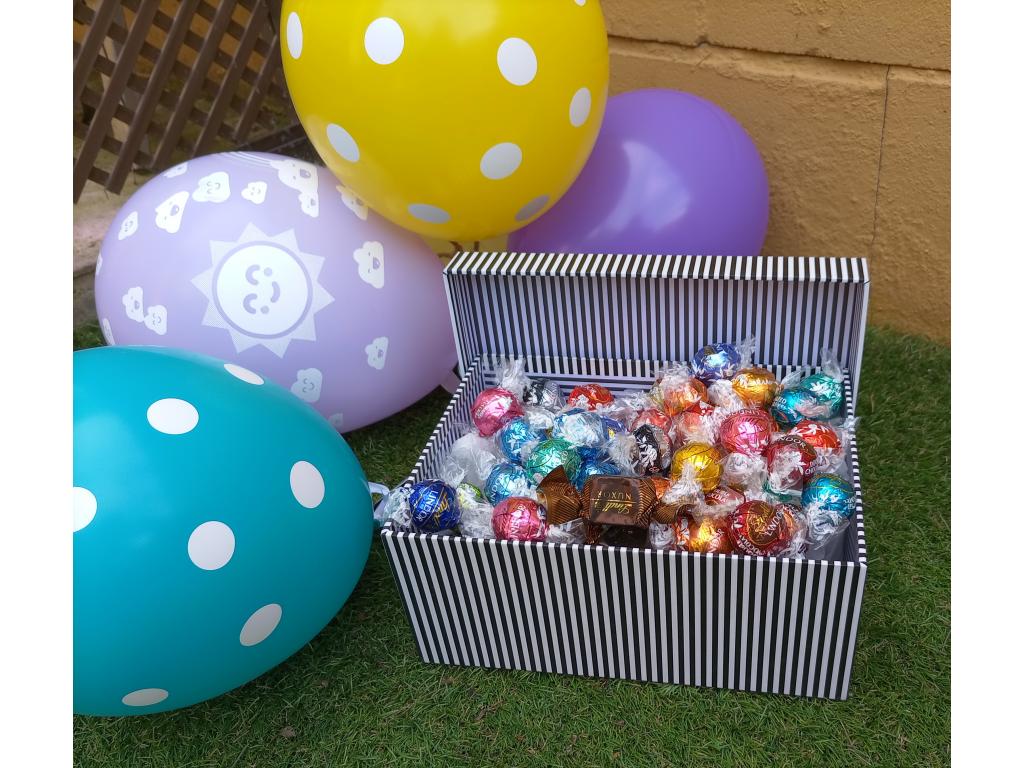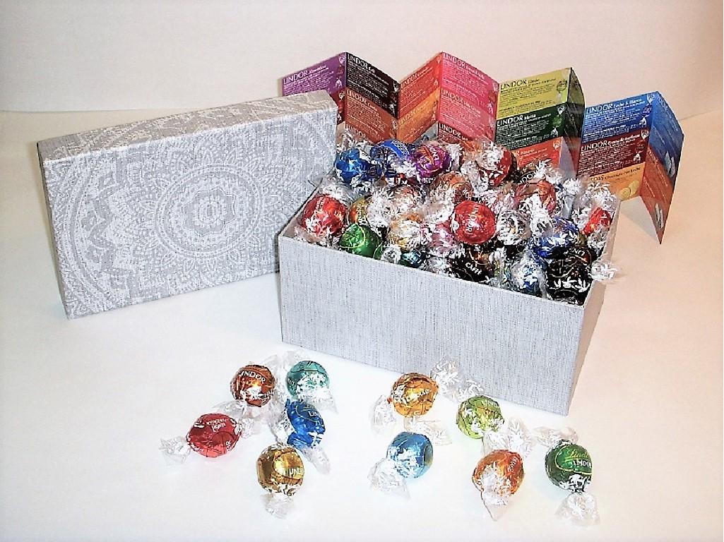 Caja forrada con 1 kilo - 80 bombones lindor surtidos. Envuelto y entregado donde nos indiques.