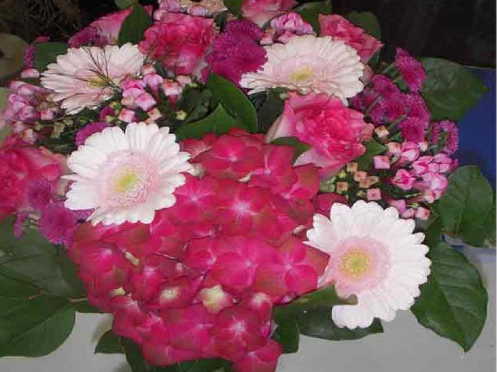 Centro variado de flores. Ramo de flores cortadas clavadas sobre esponja en precioso recipiente