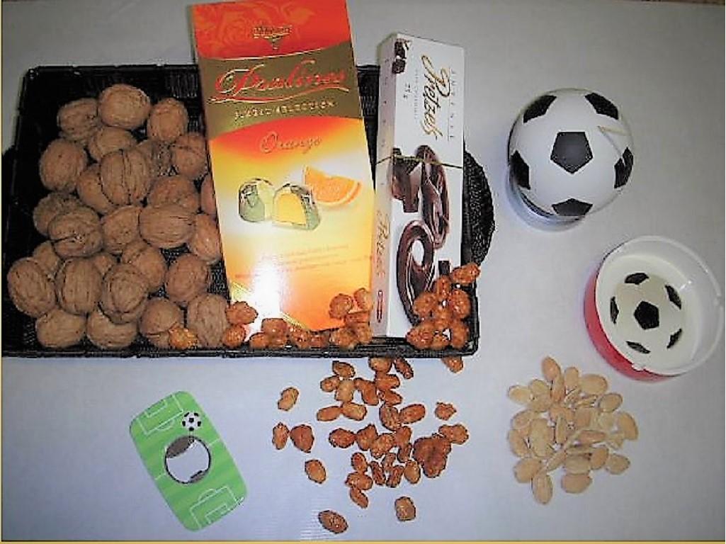 Cesta para mandar a una casa donde vas a ir a ver el fútbol, o para mandar a un forofo de este deporte. Los artÃculos se pueden incluir en cualquiera de nuestras otras cestas de la web. Indicanoslo en comentarios. Esta contiene frutos secos y chocolates, además: cenicero, palillero y abridor. El precio incluye preparación de regalo y entrega.
