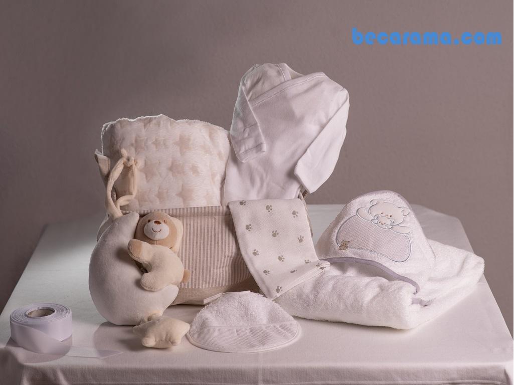 Cesta semirigida de tela estampada con asitas. Manta suave y con borrego estampada. Capa de baño con capucha y bordado. Body talla 00 de algodón 100%. Babero estampado. Gasa de algodón 100% estampada. Oso musical suave. Envuelto con celofán, globos y lazada. Entrega gratis donde nos indiques.