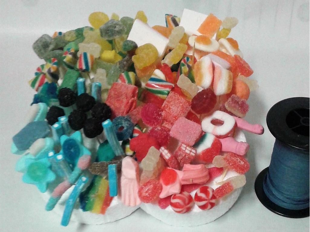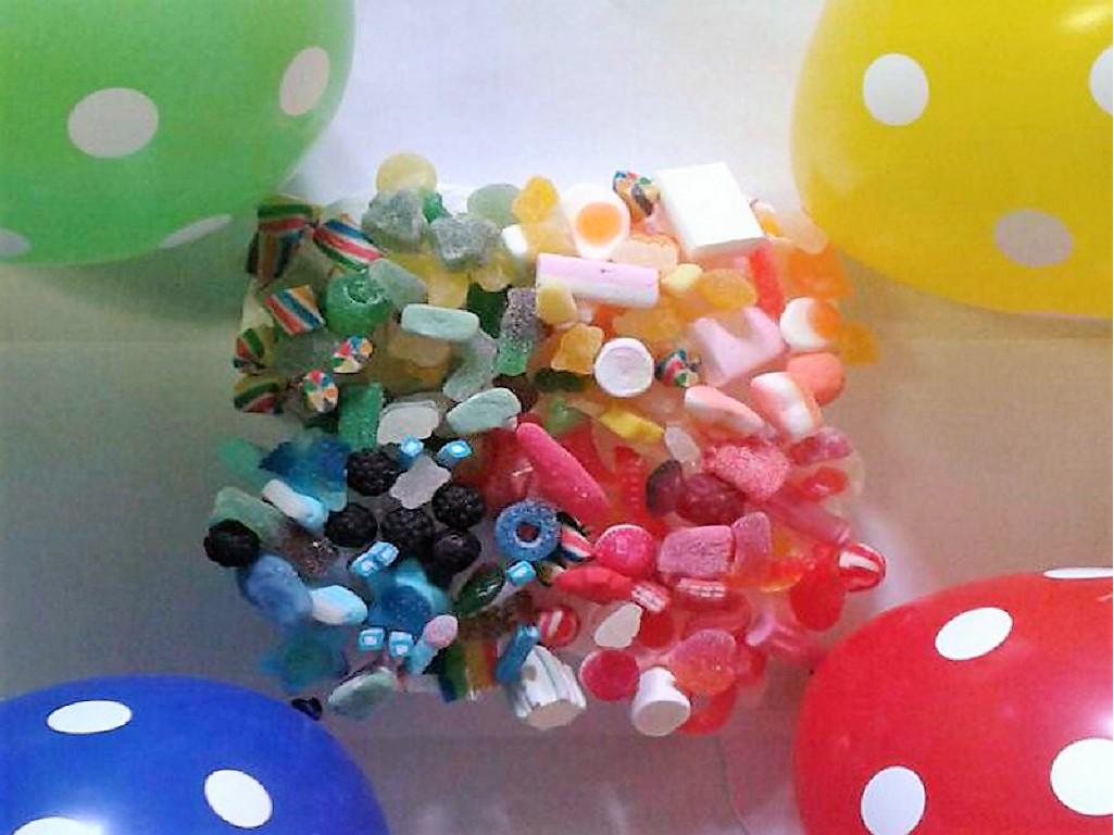 Tarta realizada con dulces chuches de los cuatro colores de parchis: rojo, verde, azul y amarillo. DivertidÃsima. Envuelta con celofán y lazadas. Acompañada de divertidos globos. Entrega gratis donde nos indiques.