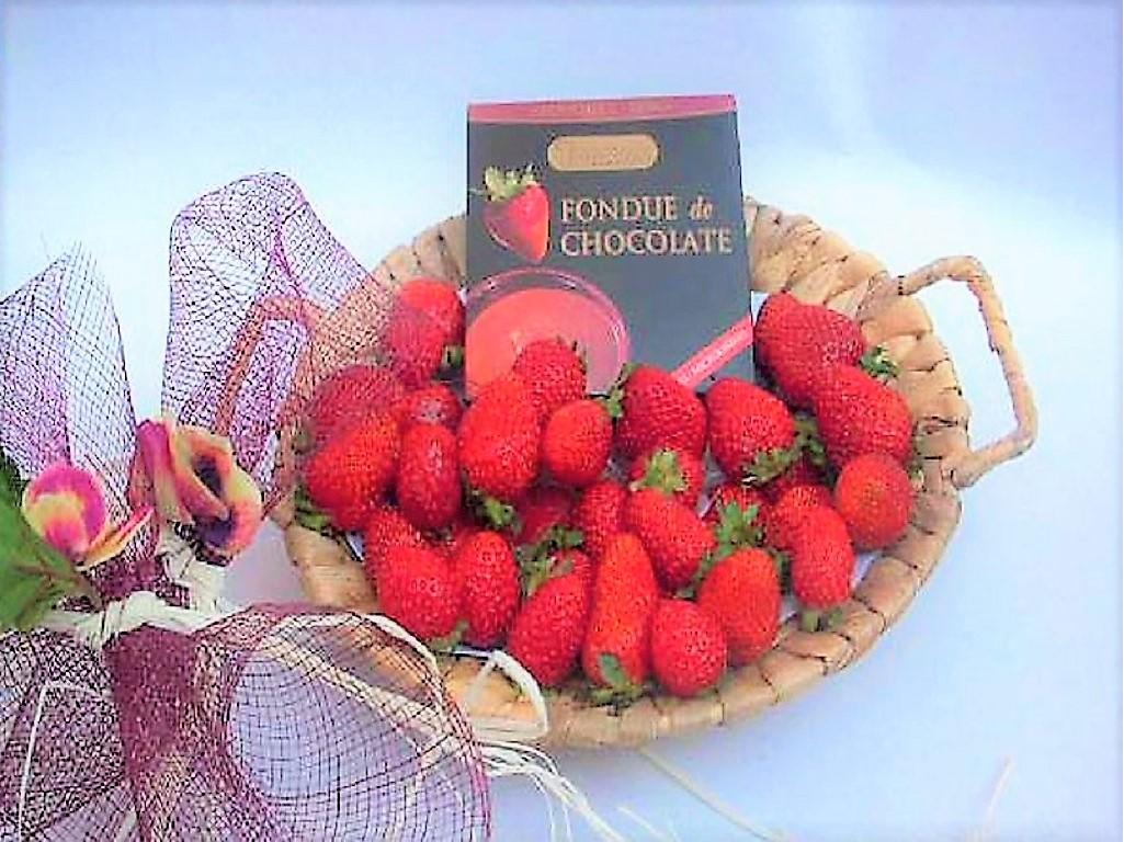 Cesta de mimbre con exquisita fondue de chocolate y un kilo de riquÃsimas fresas. Envuelto con celofán y preciosa lazada. Entrega gratis