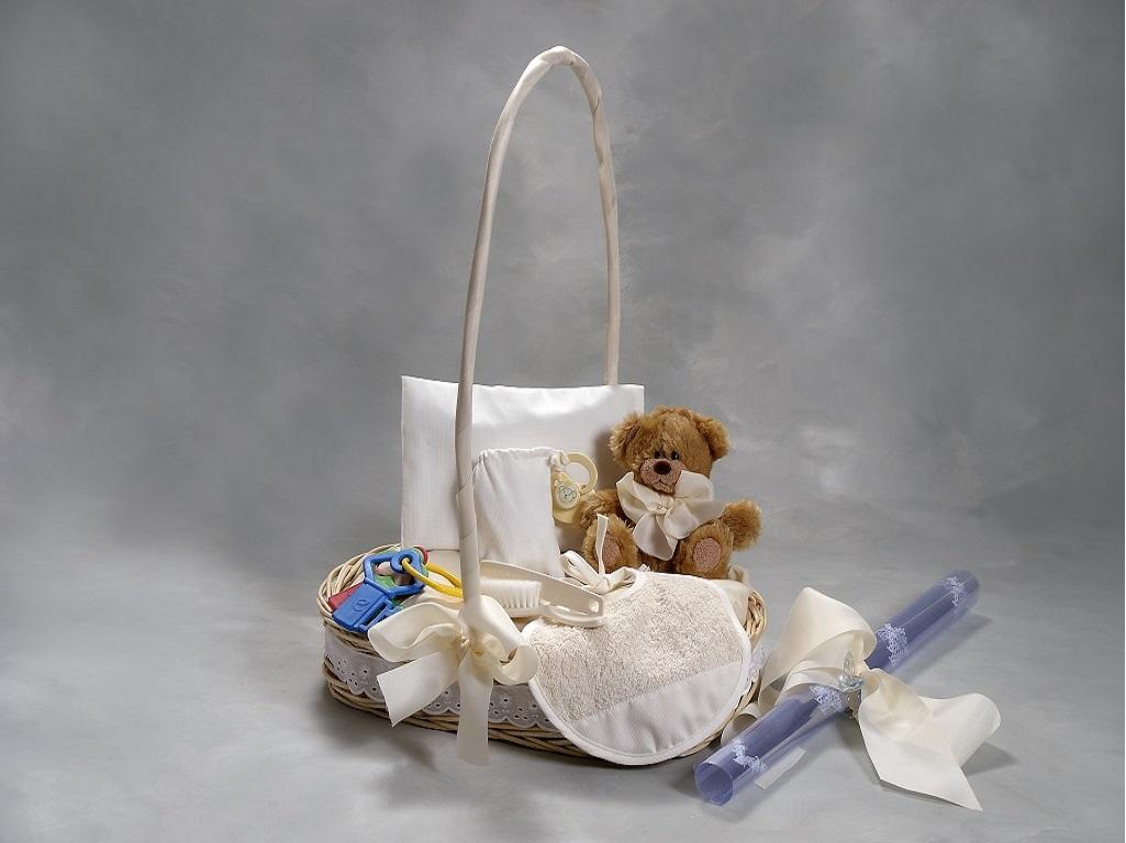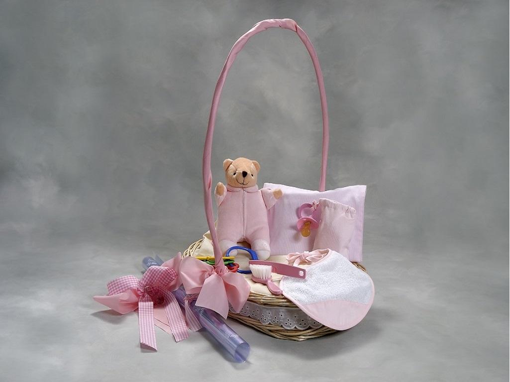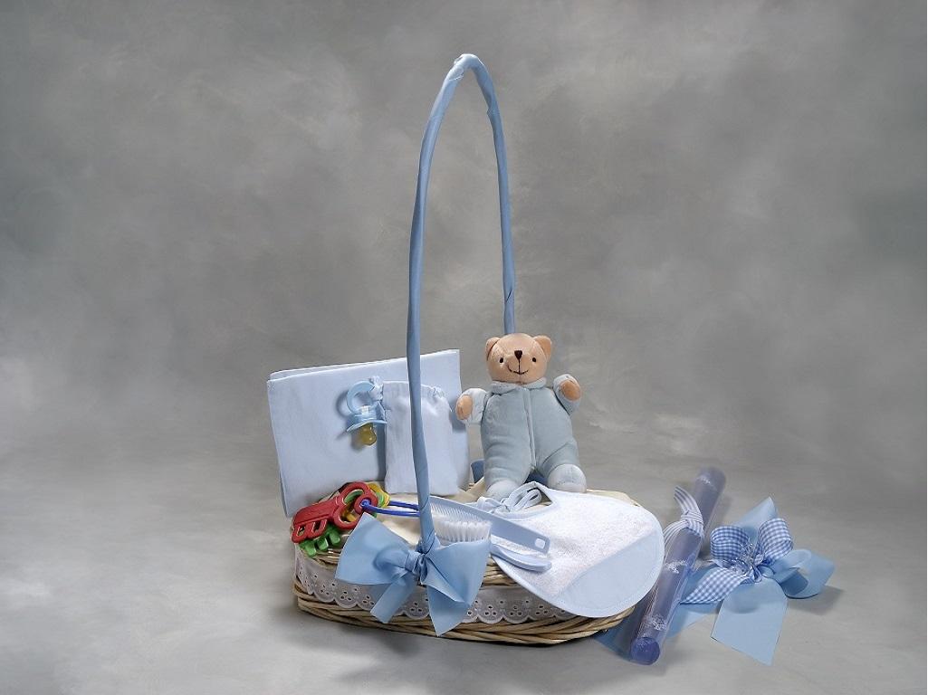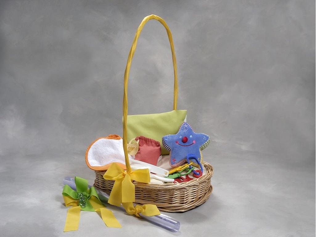 Divertido regalo para bebé, surtido y colorido. Cesta de mimbre artesanal