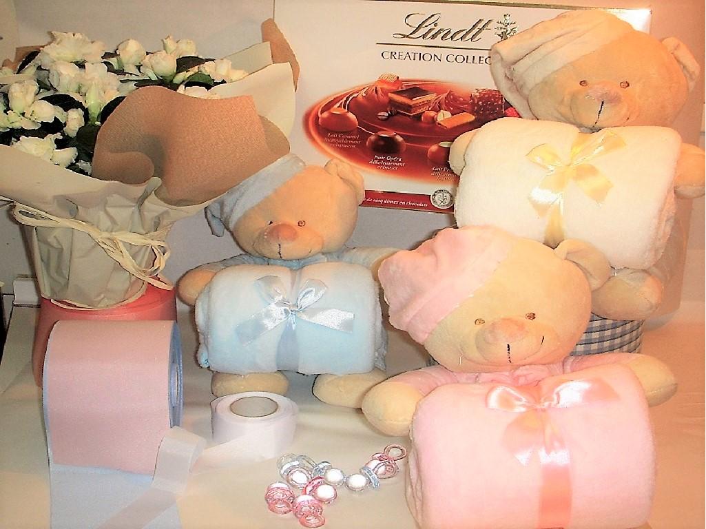 Oso suave de peluche acompañado de mantita suave para el bebé y para los padres gran caja de bombones Lindt y preciosa Azalea. Entrega gratis donde nos indiques.