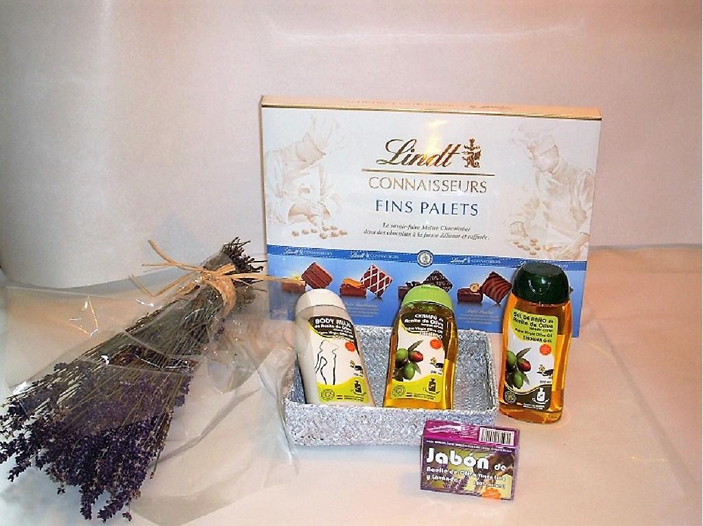 estuche de cosmética de aceite de oliva virgen extra: champu, body milk, gel de baño y pastilla de jabón. Entrega gratis