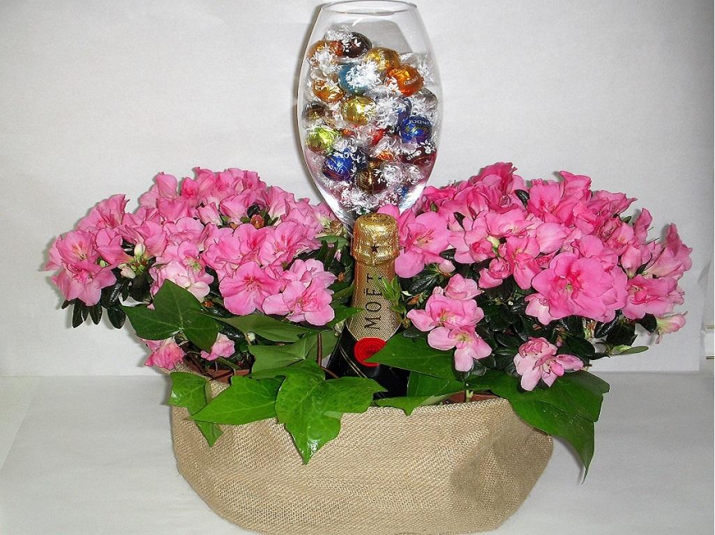 Macetero con 2 azaleas (o similar), botella de champagne Moet Chandón 37,5 cl y copa de cristal con exquisitos bombones Lindt. Tamaño grande con Botella Moet Chandón 75 cl precio 145 + iva. Entrega gratis