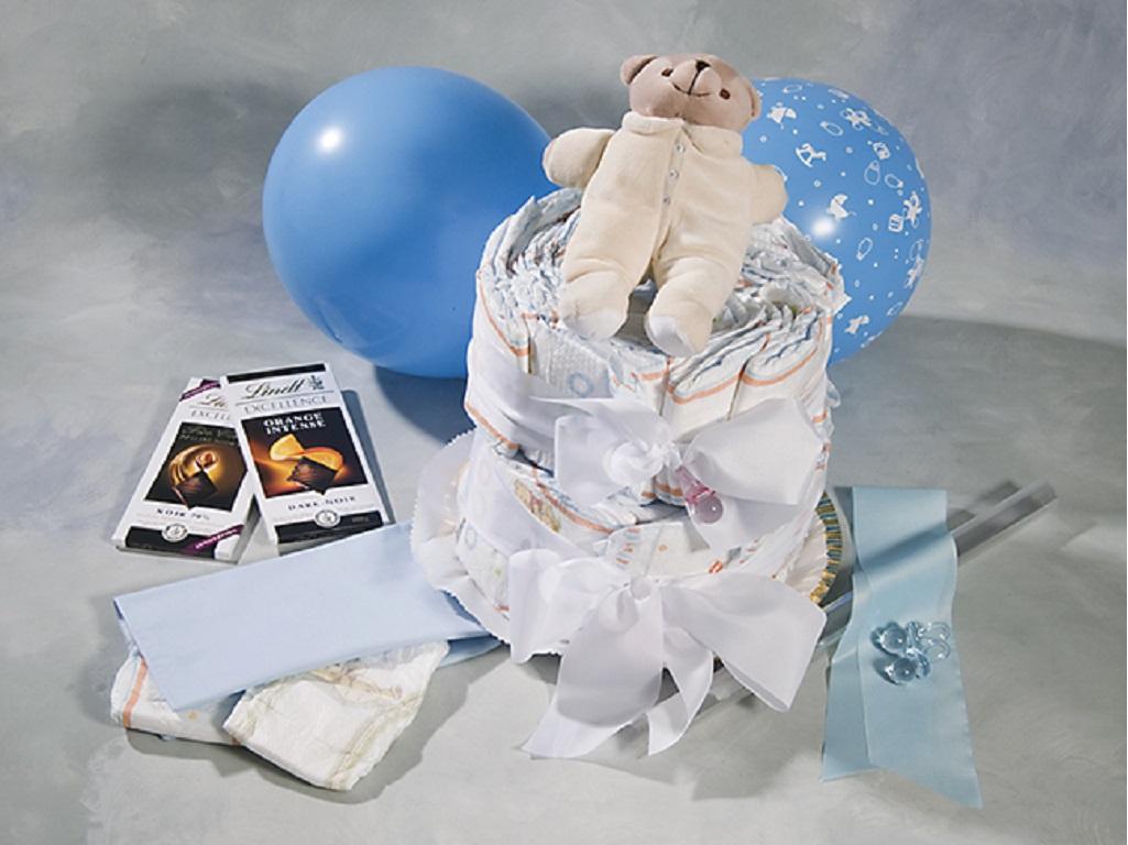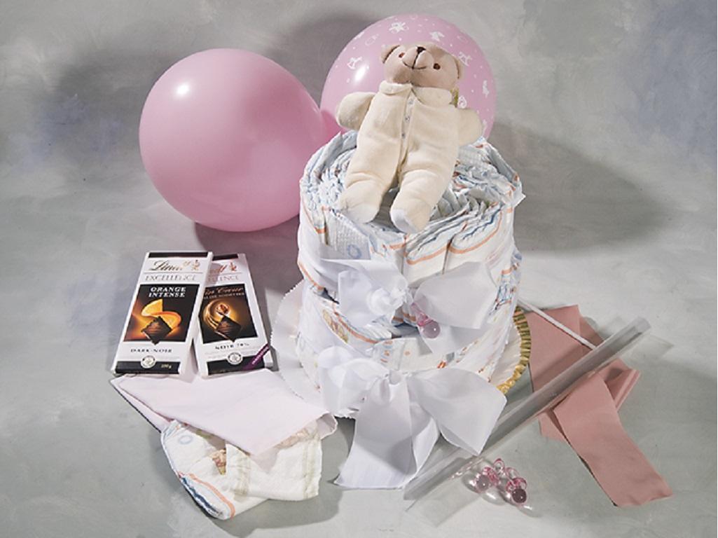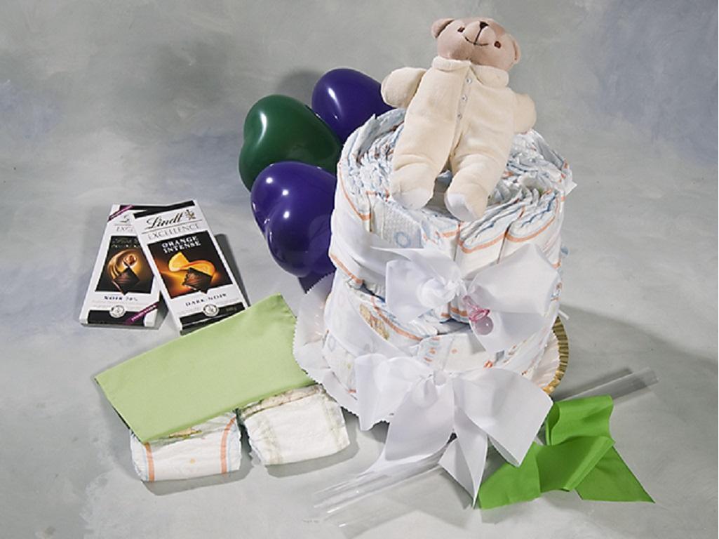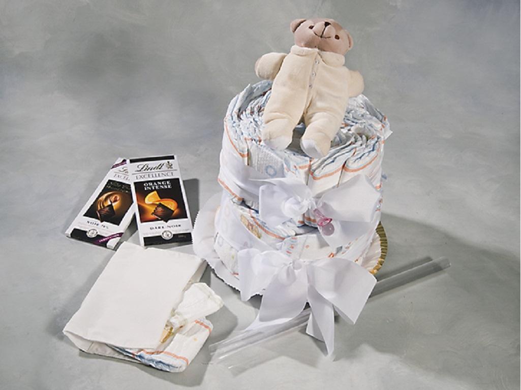 Con 35 pañales primera marca preparamos una tarta de dos pisos acompañada de dos tabletas de chocolate Lindt para los padres y portapañal y peluche para el bebe