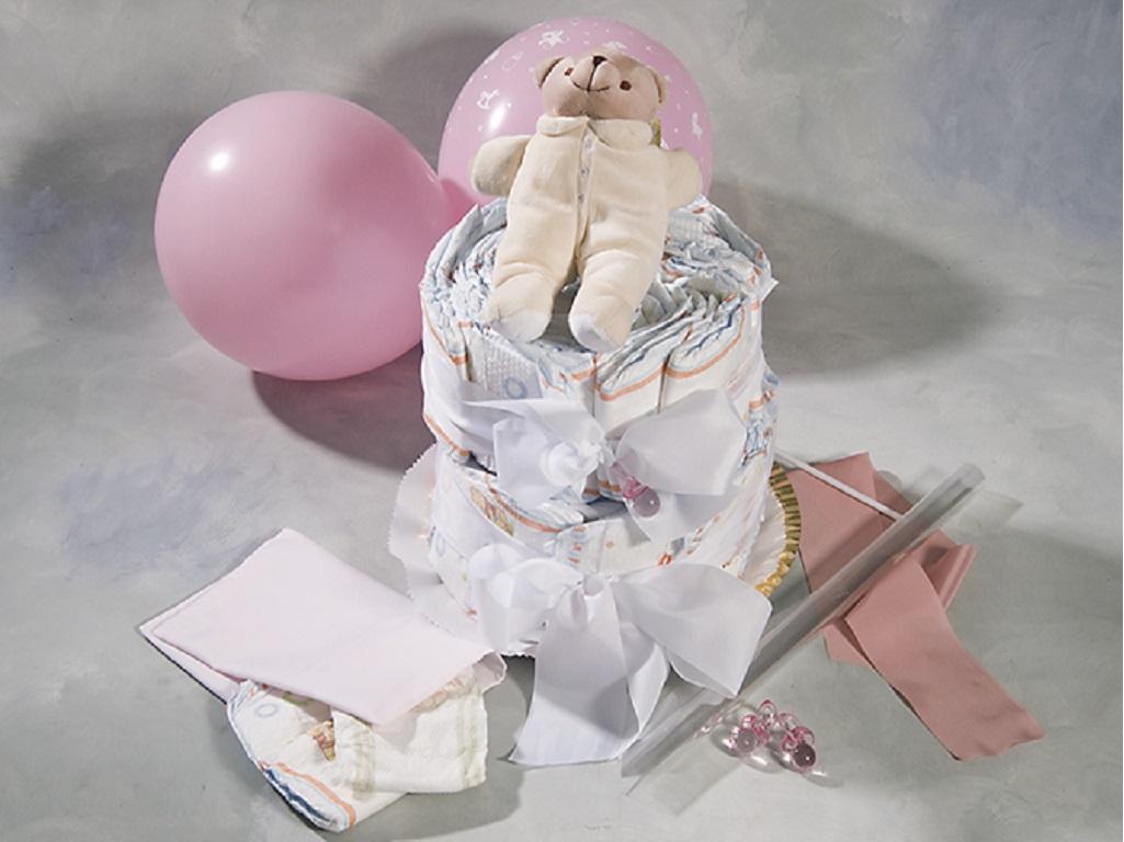 Tarta con 35 pañales de primera marca formando una tarta de dos pisos, acompañada de pijama de algodón, funda de pañales y dou dou. Envuelta con celofán, lazada y globos. Entrega gratis.