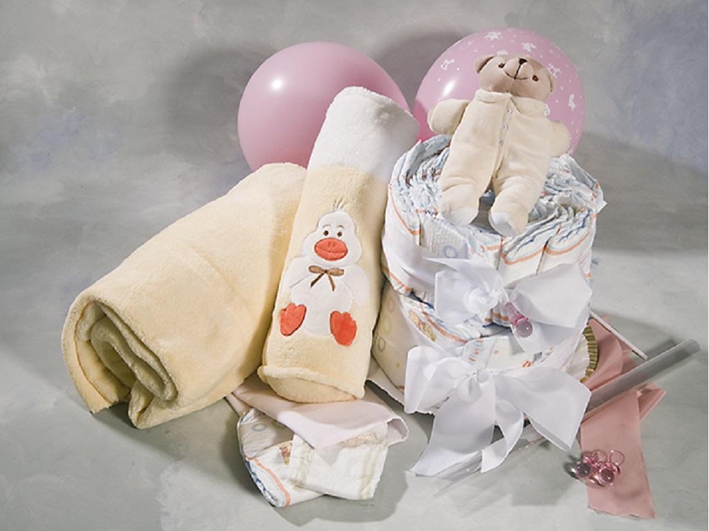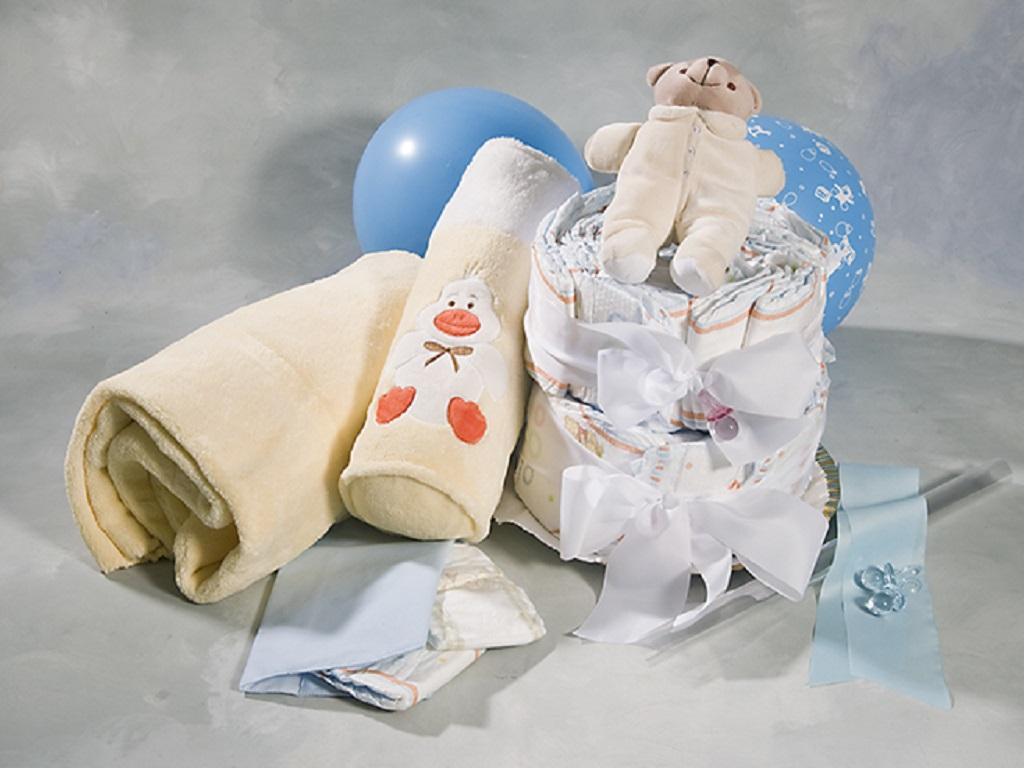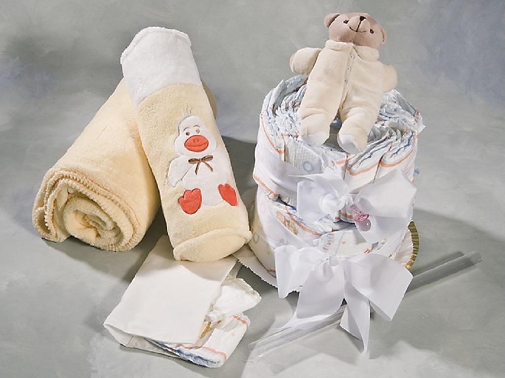 Con 35 pañales primera marca preparamos una tarta de dos pisos acompañada de manta, peluche y portapañal